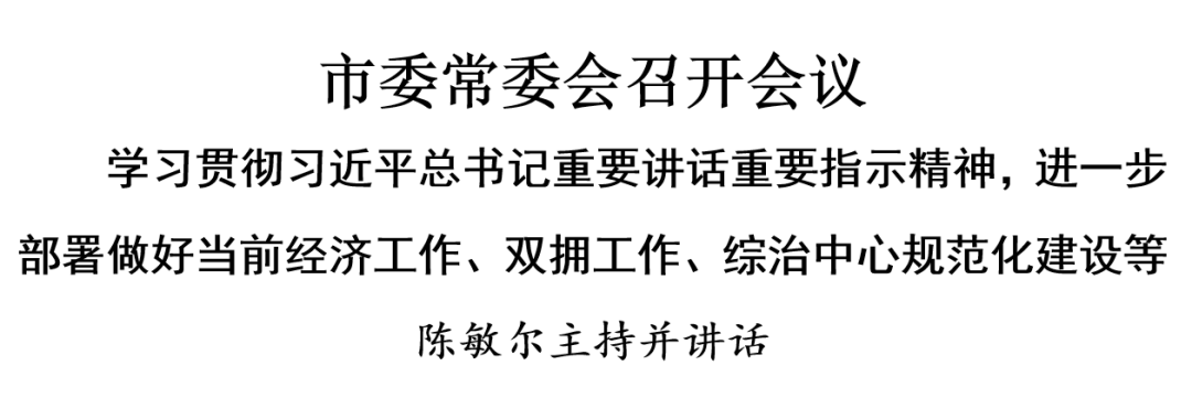 4月29日,市委常委会召开会议,学习贯彻4月25日中央政治局会议精神和习近平总书记在中央政治局第二十次集体学习时、在庆祝中华全国总工会成立100周年暨全国劳动模范和先进工作者表彰大会上的重要讲话精神,学习贯彻习近平总书记对双拥工作作出的重要指示和全国双拥模范城(县)命名大会精神,听取全市社会治安综合治理中心规范化建设情况汇报,研究部署有关工作。市委书记陈敏尔主持会议并讲话。